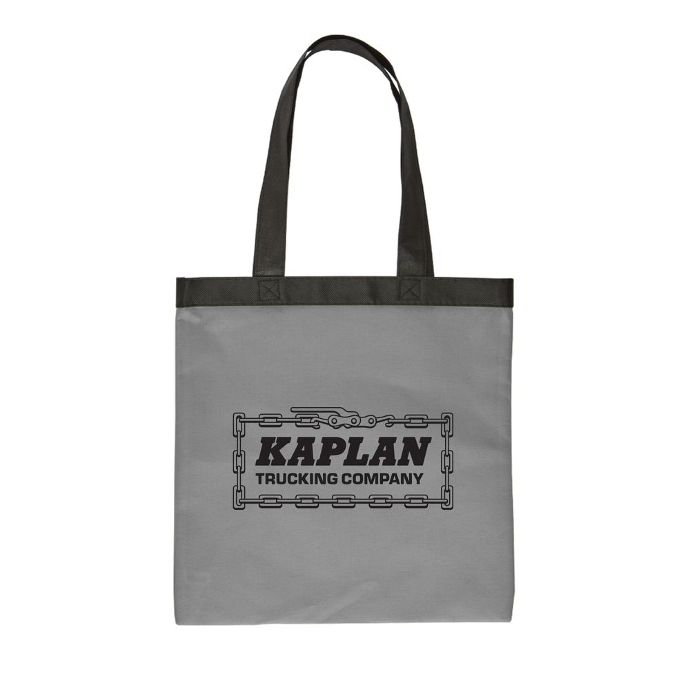 Basic 13” x 14” non-woven polypropylene tote bag with 22" black handles and top trim.